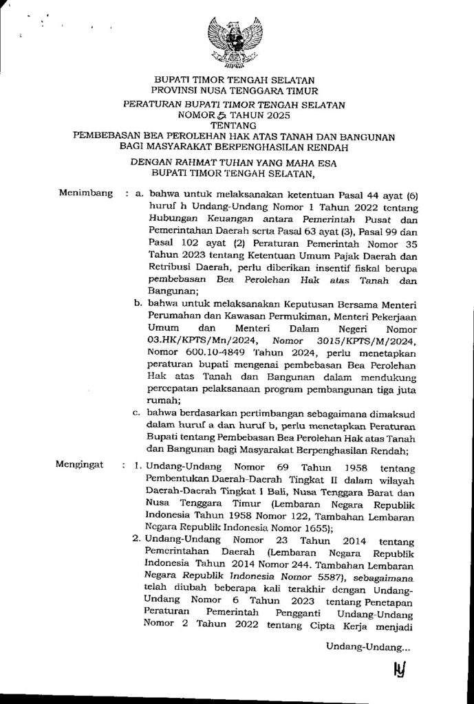 Peraturan Bupati Timor Tengah Selatan Nomor 5 Tahun 2025 tentang Pembebasan Bea Perolehan Hak Atas Tanah dan Bangunan Bagi Masyarakat Berpenghasilan Rendah